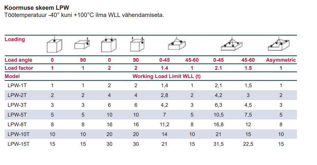 - Märkus: LPW on WLL (töökoormuse piir) hinnanguga, eeldades, et õige keevitusprotseduur on hoolikalt järgitud ja teostatud sobivalt kvalifitseeritud keevitaja poolt, et säilitada toote terviklikkus ja vastavus ohutusnõuetele.