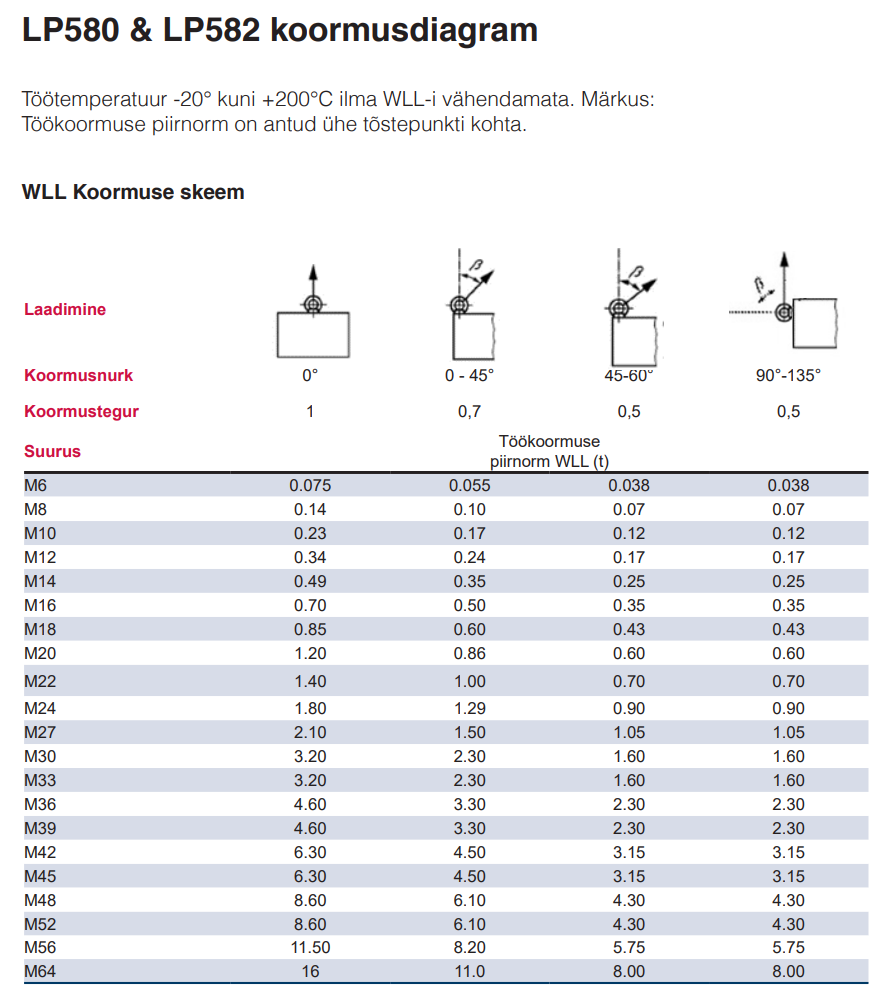 - WLL näit: LP582 on märgistatud WLL-ga (sirge koormus 0°) ja noolega, mis näitab vastavat koormuse suunda. WLL tabel pakub kohaldatavat WLL-i teiste koormuse suundade jaoks.